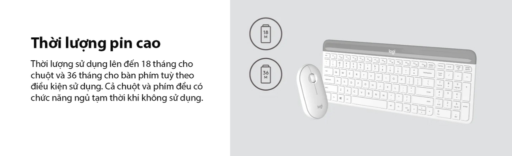 Sử dụng năng lượng hiệu quả có nghĩa là bạn có thể sử dụng với tuổi thọ pin bàn phím 36 tháng và chuột 18 tháng. Cả hai thiết bị đều chuyển sang chế độ sleep để tiết kiệm pin khi không sử dụng.