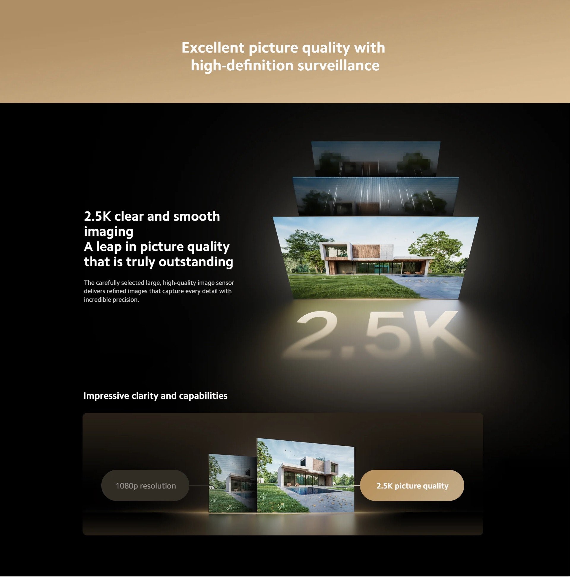 Độ phân giải 2560 x 1440 (2.5K) và khẩu độ f/1.6 giúp camera ghi lại hình ảnh rõ nét, ngay cả trong điều kiện ánh sáng yếu. Góc nhìn rộng 136° cho phép giám sát diện tích lớn.