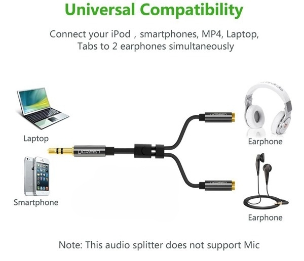 Cáp Audio 3.5mm 1 ra 2 UGREEN 10532 20cm kết nối hầu hết các thiết bị với cổng 3.5mm phụ trợ ( AUX ) như máy nghe nhạc MP3, điện thoại thông minh, máy tính bảng, máy tính etc.. một giải pháp tuyệt vời để chia sẻ âm nhạc, phim và trò chơi với gia đình và bạn bè của bạn .