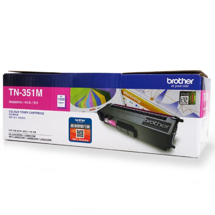 TN-351M là mã sản phẩm của hộp mực laser màu Đỏ/Hồng (Magenta Toner Cartridge) dung lượng tiêu chuẩn chính hãng Brother.