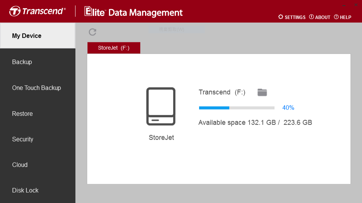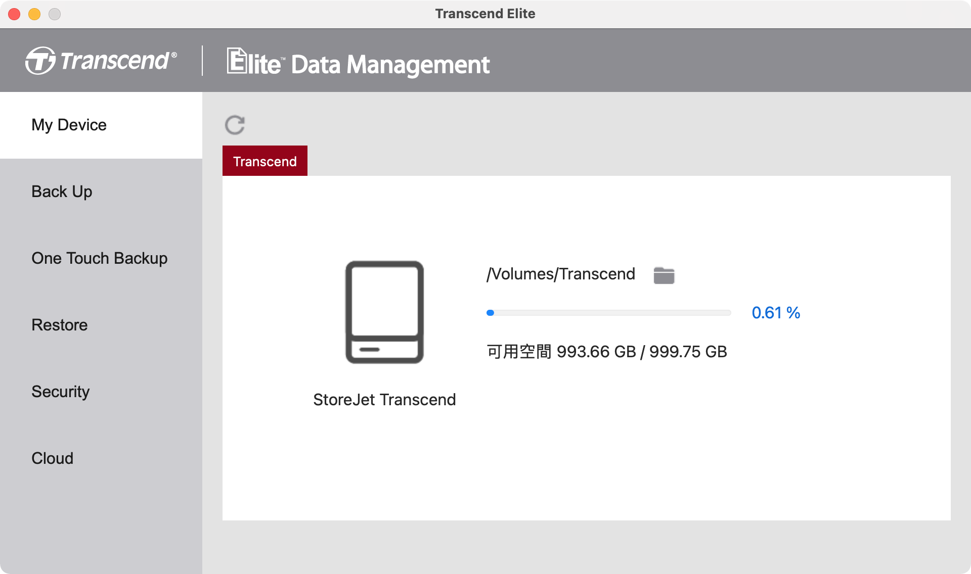 Khởi chạy ứng dụng Transcend Elite. Thông tin ổ đĩa và dung lượng khả dụng sẽ được hiển thị.