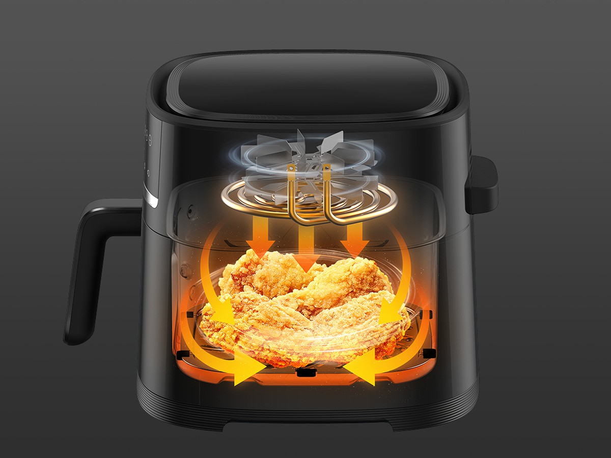 Nồi được trang bị công suất 1.500W kết hợp 9 cánh quạt giúp luân chuyển khí nóng 360° đều khắp khoang, làm chín thực phẩm nhanh, giòn ngon, giữ độ ẩm và chất dinh dưỡng đồng thời giảm lượng dầu mỡ.