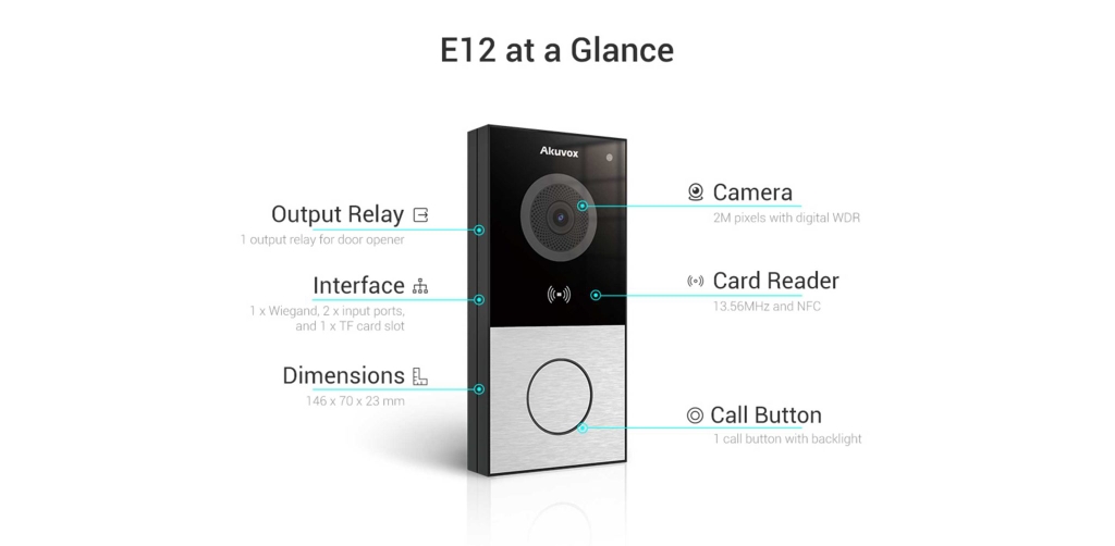 Akuvox E12S là nút bấm chuông cửa IP nhỏ gọn dùng cho hệ thống intercom và kiểm soát ra vào. Thiết bị tích hợp camera 2MP góc rộng, đầu đọc thẻ từ và giao tiếp SIP, cho phép người dùng đàm thoại hai chiều, mở khóa cửa từ xa và quản lý qua mạng IP hoặc ứng dụng di động. Thiết bị có thiết kế chống nước IP65, phù hợp lắp đặt ngoài trời cho nhà ở, văn phòng hoặc căn hộ.