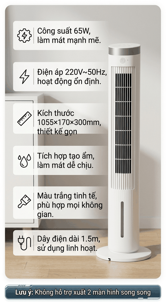 Kích thước gọn gàng: Với thông số 1055 × 170 × 300mm, quạt có kiểu dáng thanh mảnh, không chiếm nhiều diện tích, dễ dàng đặt ở các góc phòng khách, phòng ngủ hay phòng làm việc.