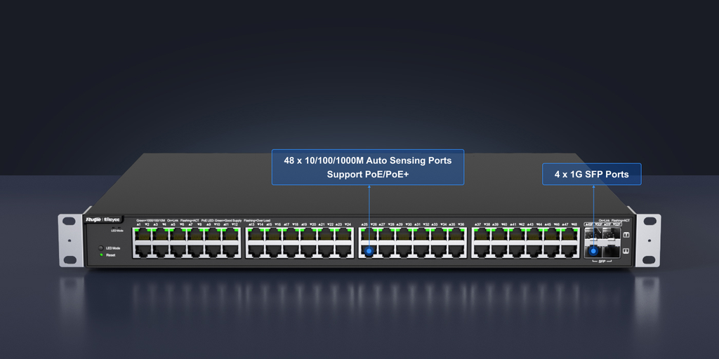 - 48 cổng 10/100/1000BASE-T PoE/PoE+ tổng công suất PoE: 370W