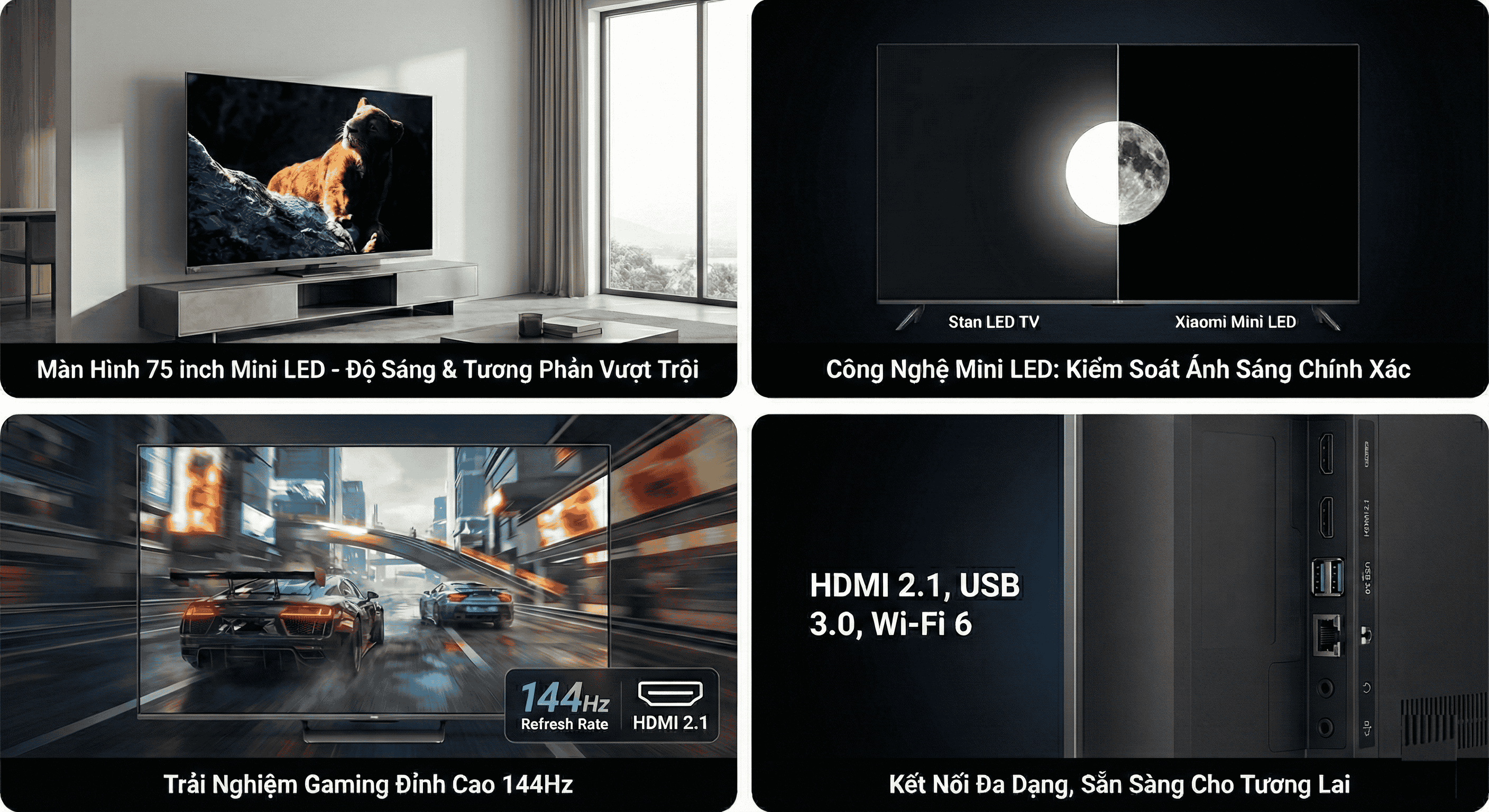 Điểm "ăn tiền" nhất trên Xiaomi S Pro 75 chính là tấm nền Mini LED. Khác với LED truyền thống, công nghệ này sử dụng hàng nghìn đèn LED siêu nhỏ, được chia thành hàng trăm (thậm chí hàng ngàn) vùng làm mờ cục bộ (Local Dimming Zones).